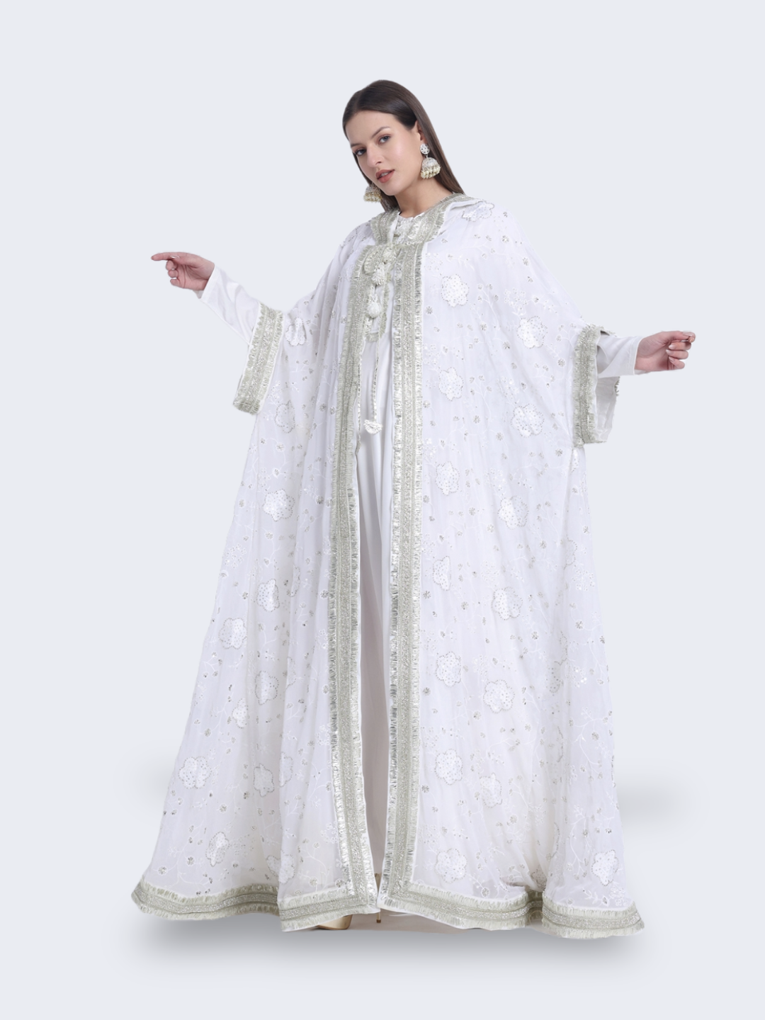 Radiating regal elegance, Noor Al Malak embodies the luminous grace of royalty. Draped in flowing white with intricate gold embellishments, it mirrors the soft glow of moonlight on a crown. A perfect blend of tradition and modern luxury, this masterpiece exudes poise, purity, and timeless sophistication fit for a queen.