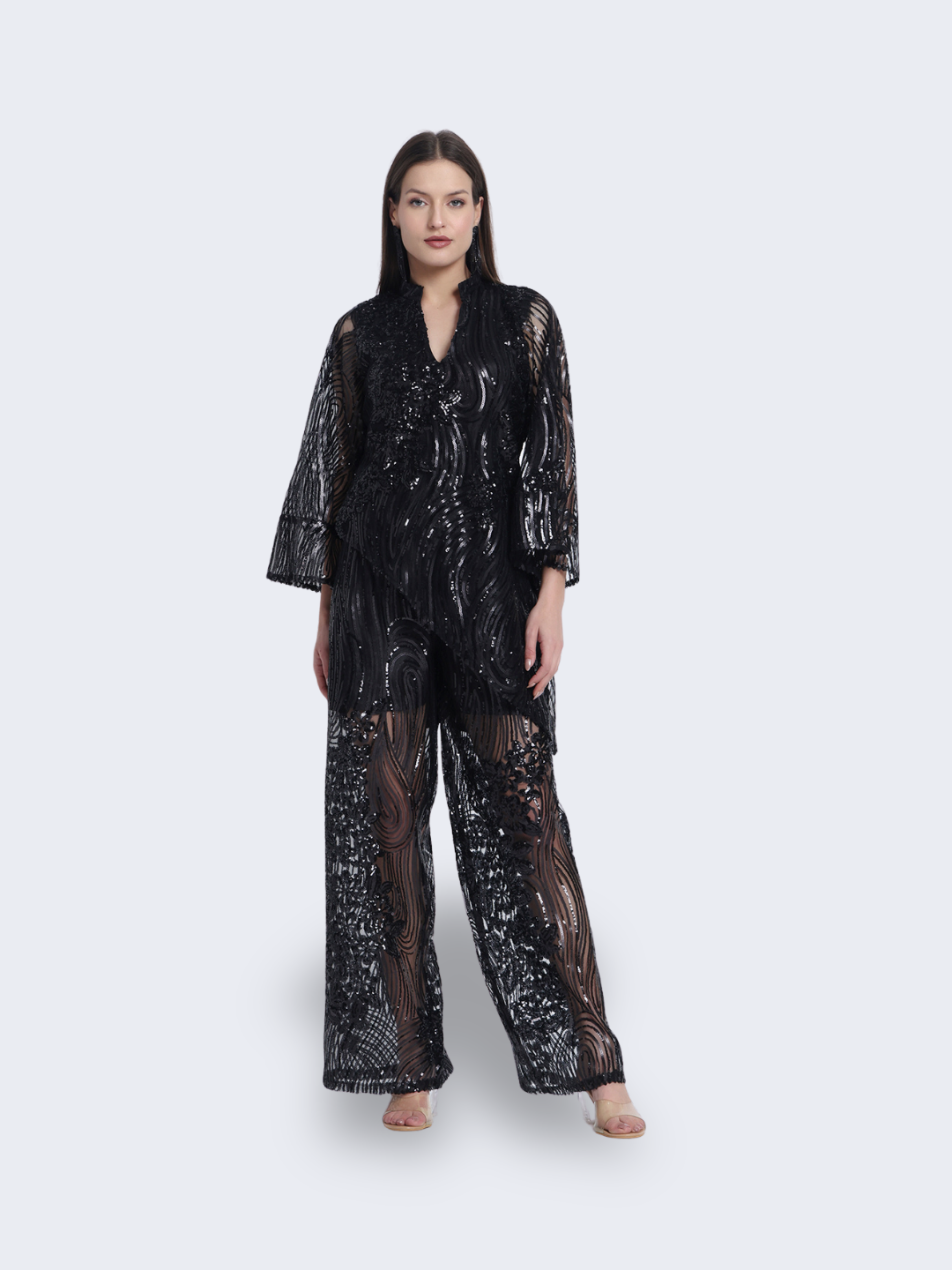 Embrace ethereal elegance with our "Celestial Shadows Outfit." This enchanting ensemble features a sheer black design with wide-leg pants and bell sleeves, exuding a mystical allure perfect for any grand occasion. Let "Celestial Shadows" illuminate your style with its otherworldly charm.