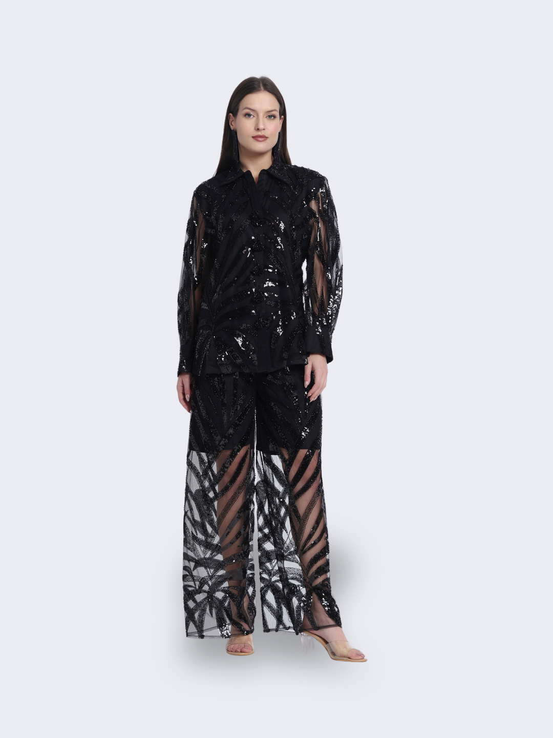 Shine like the night sky in our "Celestial Twilight Ensemble." This stunning black outfit, adorned with a sheer, sequined overlay, captures the essence of elegance and mystery. Perfect for any grand occasion, "Celestial Twilight" will elevate your style with its ethereal charm and sophistication.