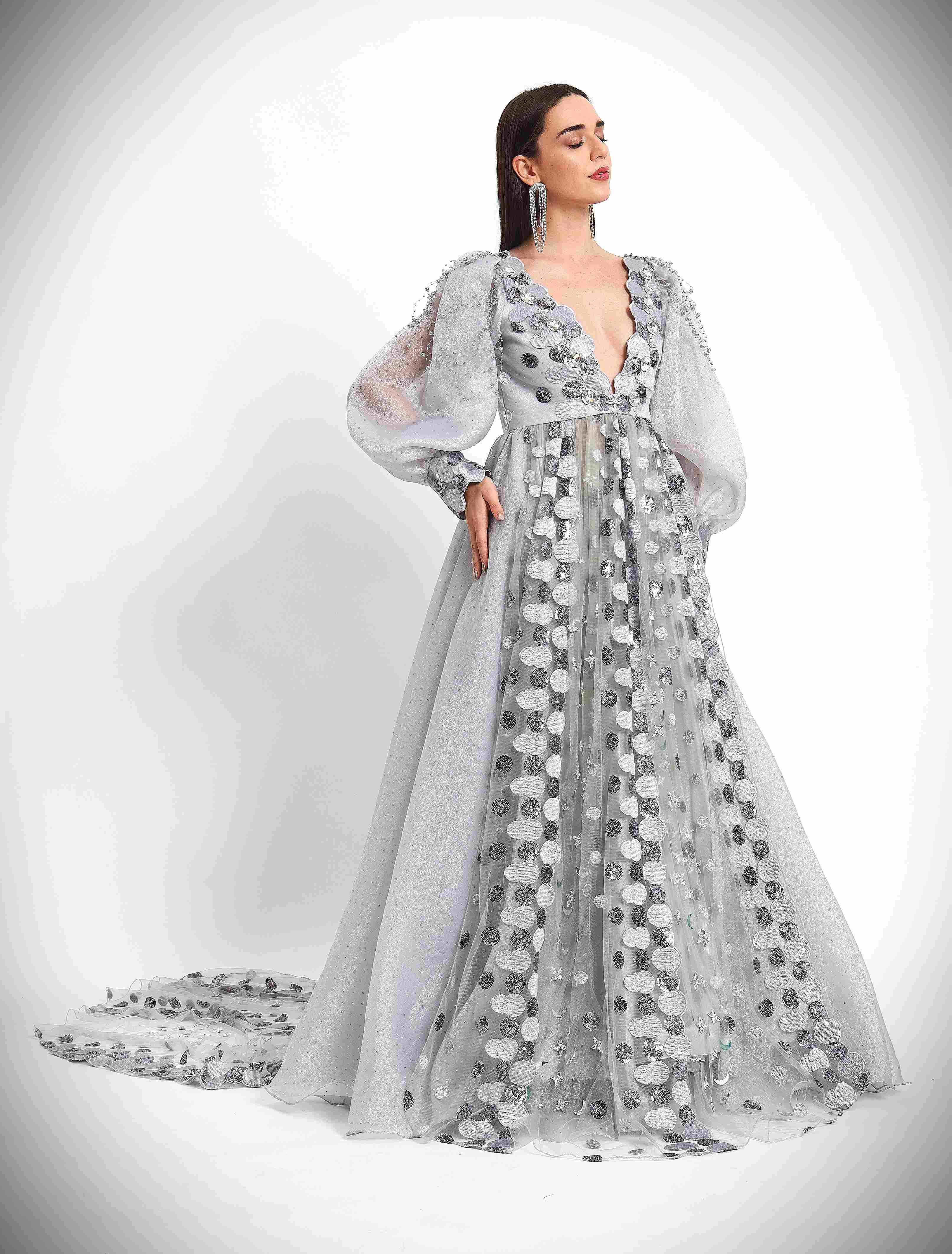 The Silver Eclipse Gown is a bold and dazzling masterpiece, designed for those who are unafraid to stand out. This stunning gown features a deep plunging neckline, voluminous sleeves, and an intricate polka-dot pattern in metallic silver, giving it an avant-garde appeal. The flowing train adds drama, making it perfect for red carpet events or high-fashion soirées. Embrace your inner goddess with this shimmering creation, perfect for those who love to make a statement.