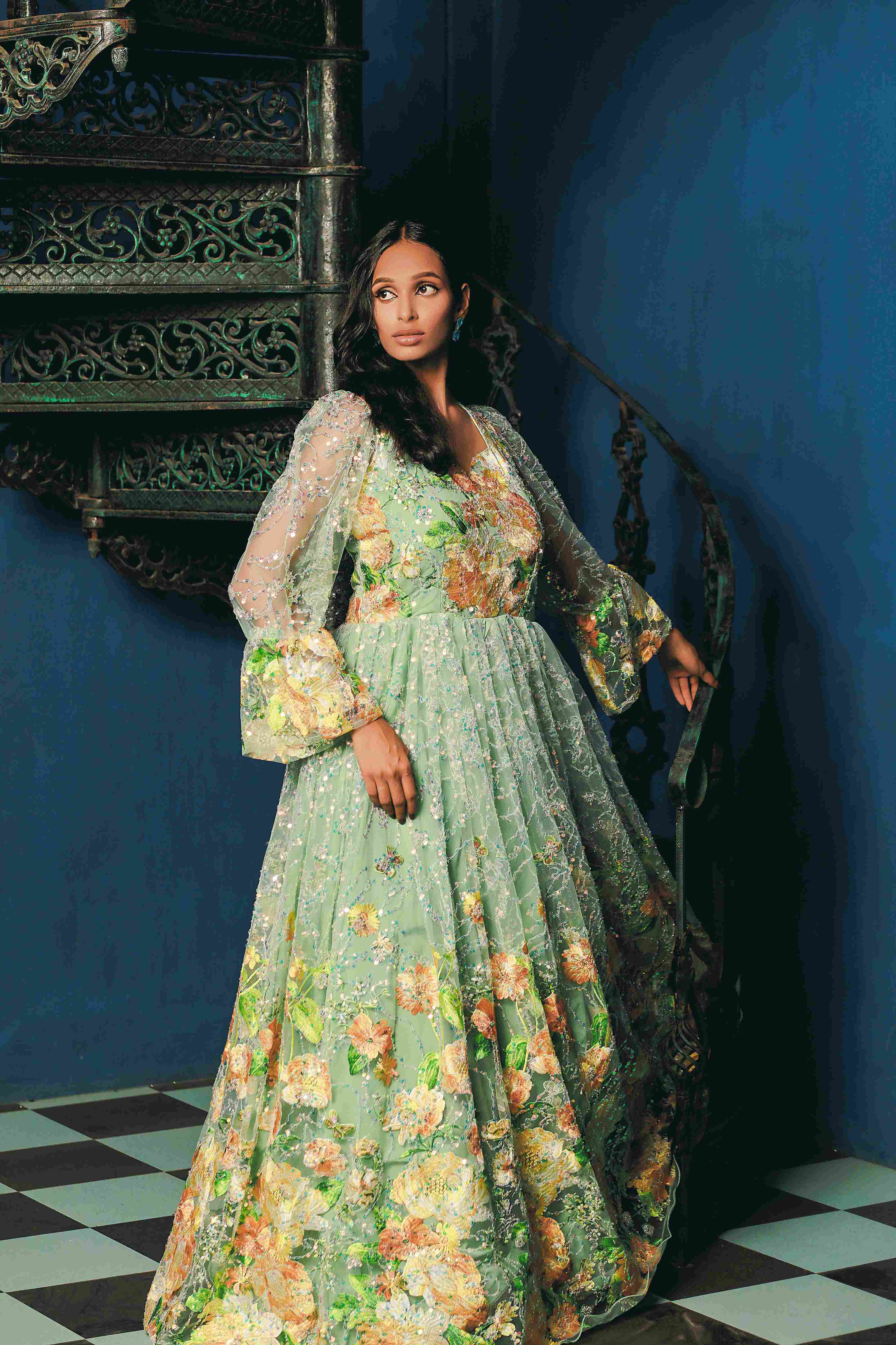 Emerald Blossom Gown – A Floral Symphony in Green