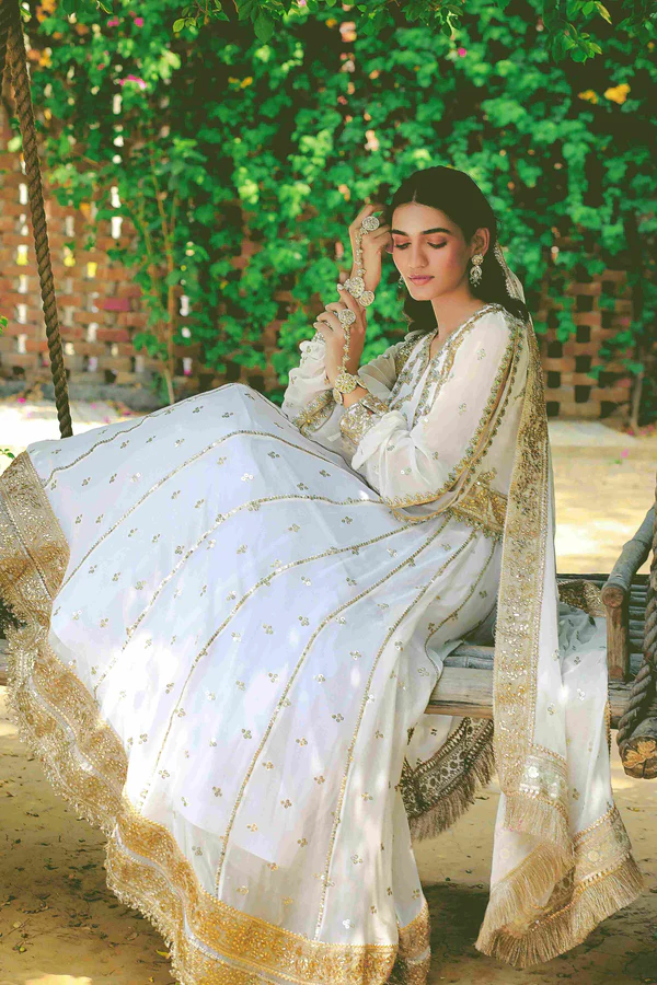The Golden Grace Anarkali set from the Amber Collection features a beautiful white base adorned with intricate golden embroidery. This luxurious ensemble can be styled with delicate jewelry and elegant footwear for a complete look. Perfect for grand occasions such as weddings, festive celebrations, and upscale events, the Golden Grace Anarkali set is designed to make you shine.
