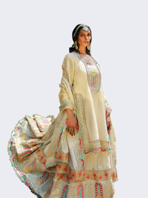 A timeless Anarkali crafted with intricate silver embroidery and delicate lace detailing. Perfect for an elegant, heritage-inspired look.