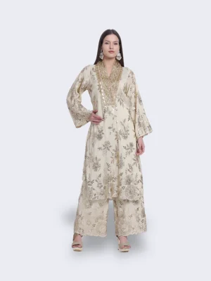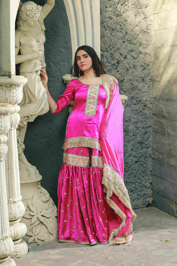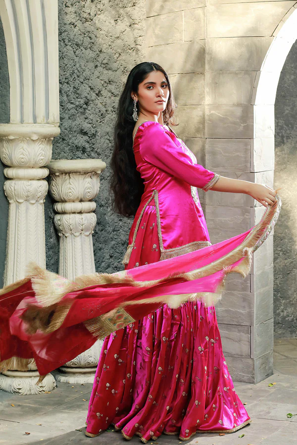 The Rose Royale gharara from the Amber Collection features rich pink satin and intricate Banarasi craftsmanship, creating a regal and elegant ensemble.