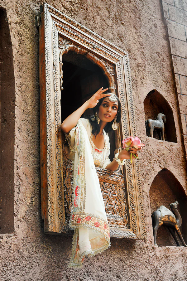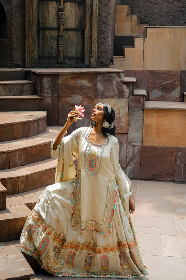 Step into a world of regal beauty with the Amber Royal Anarkali Set, where timeless tradition blends seamlessly with modern elegance. This exquisite ivory Anarkali, adorned with intricate embroidery in vibrant hues of red, gold, and emerald, captures the essence of India’s rich cultural tapestry. The luxurious fabric drapes gracefully, while the intricate hand-stitched motifs evoke a sense of royal charm.