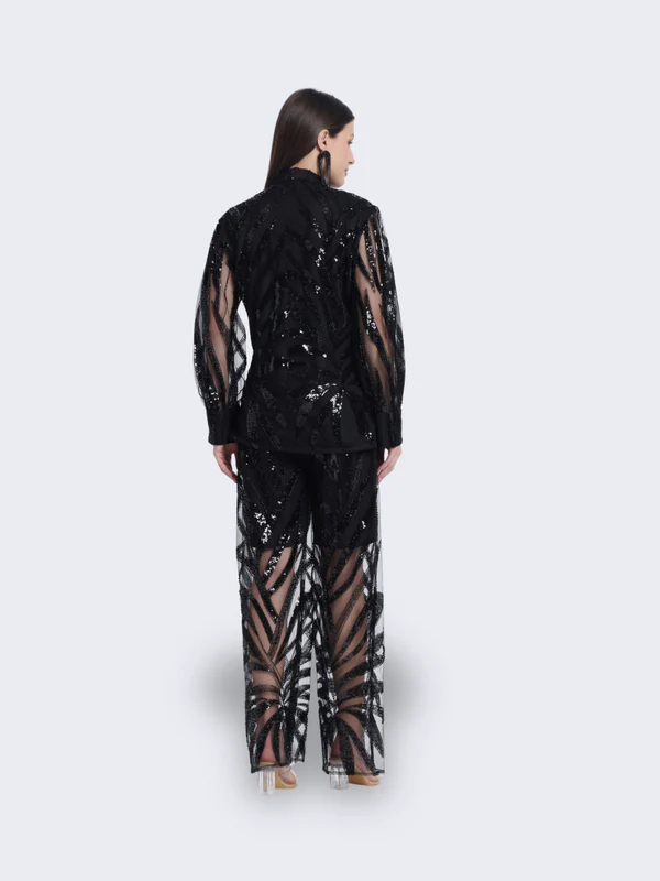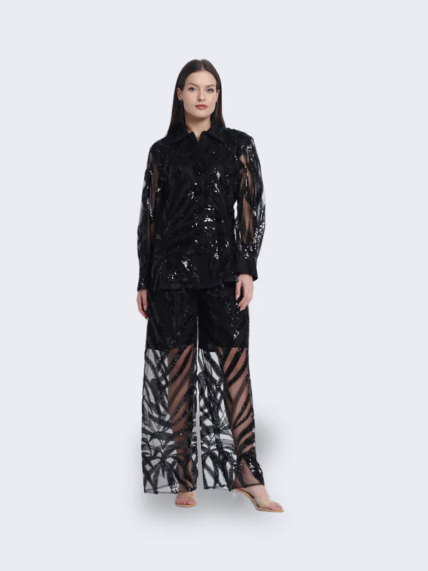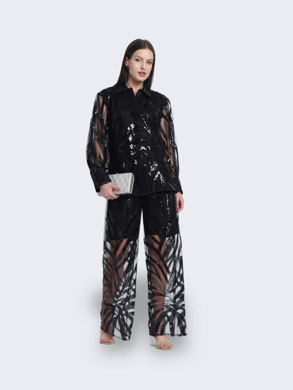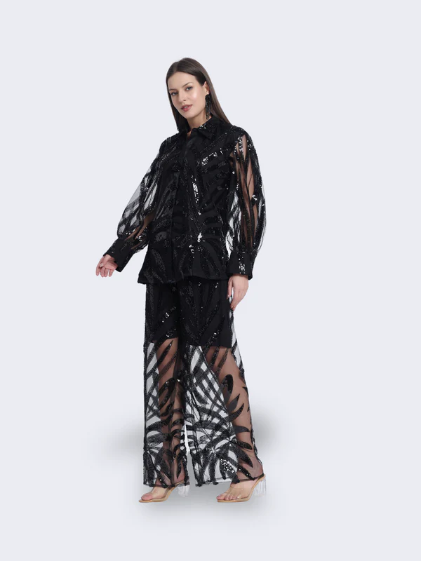 Shine like the night sky in our “Celestial Twilight Ensemble.” This stunning black outfit, adorned with a sheer, sequined overlay, captures the essence of elegance and mystery. Perfect for any grand occasion, “Celestial Twilight” will elevate your style with its ethereal charm and sophistication.