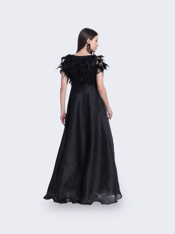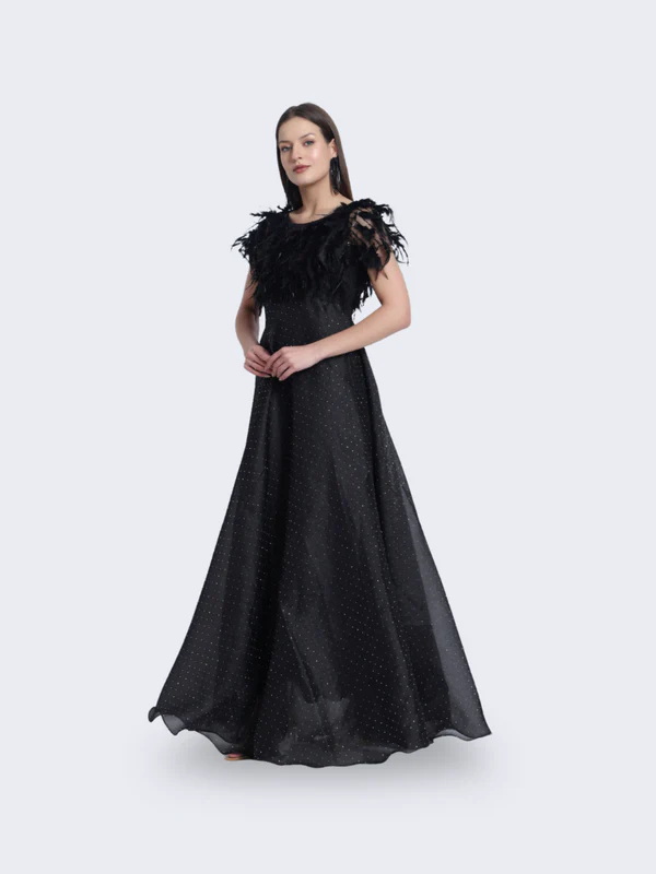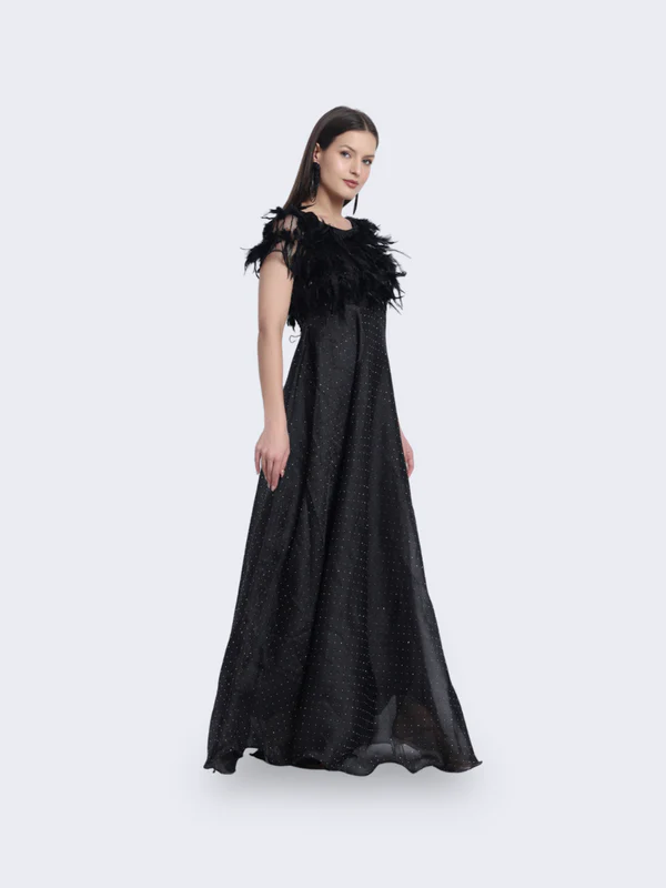 Drape yourself in the timeless allure of the Ebon Enchantment Gown. Crafted from luxurious black fabric, this floor-length stunner features a classic square neckline, wide shoulder straps, and a daring high slit. Shimmering embellishments catch the light, adding a touch of glamour to your entrance. Paired with a sleek silver clutch, you’ll captivate any room with effortless elegance.