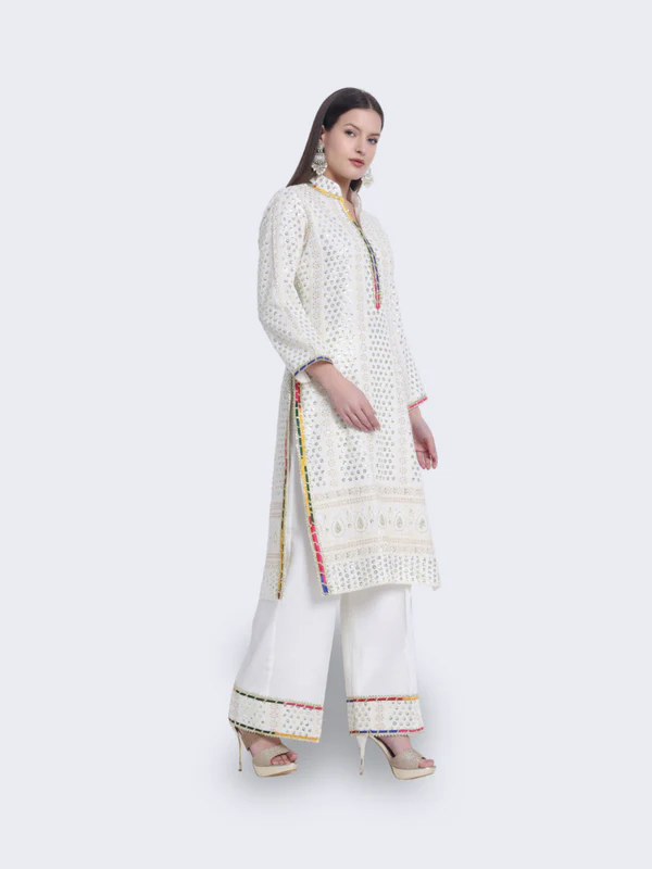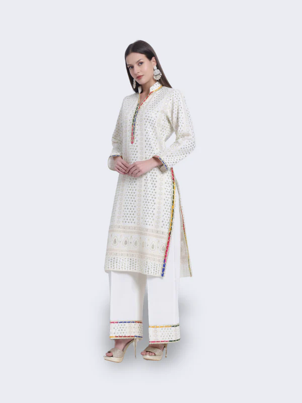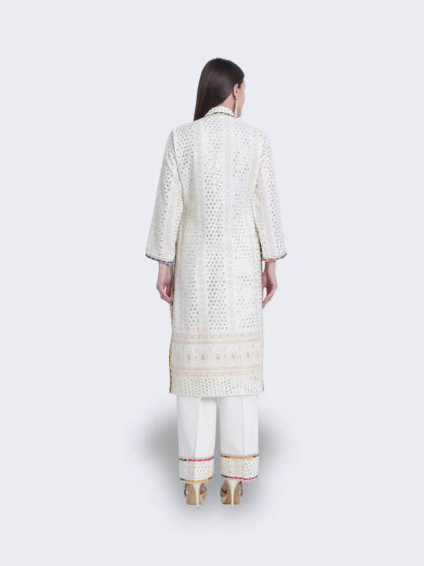 Step into timeless elegance with our “Enchanted White Ensemble.” This exquisite cream-colored traditional outfit features a long, white kurta adorned with intricate patterns and embroidery, paired with matching white trousers with embroidered cuffs. Perfect for grand occasions, the “Enchanted White Ensemble” exudes sophistication and grace.