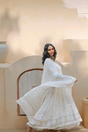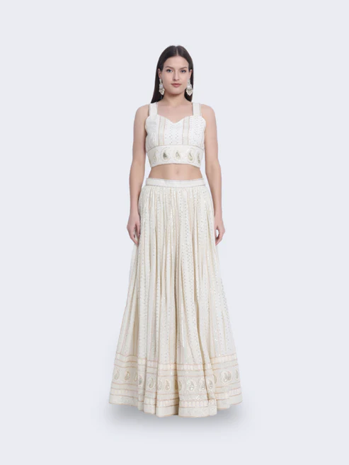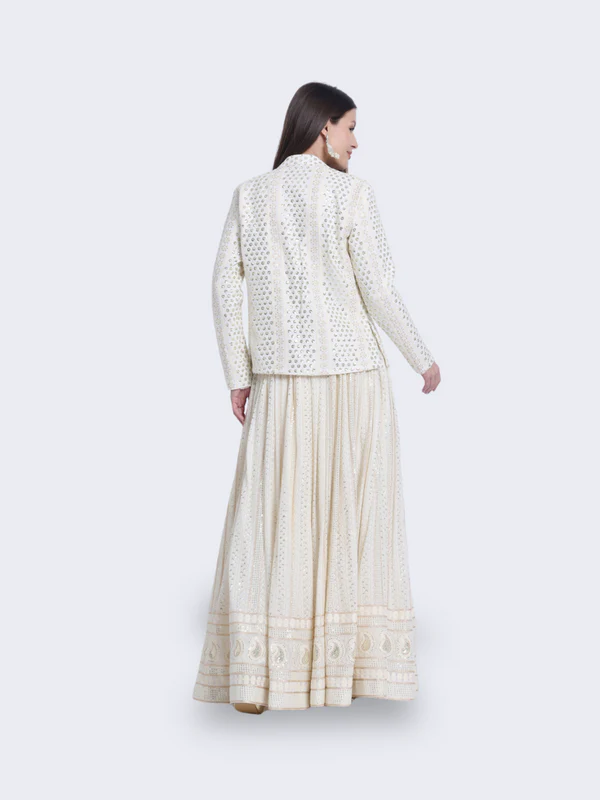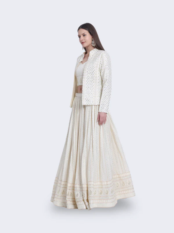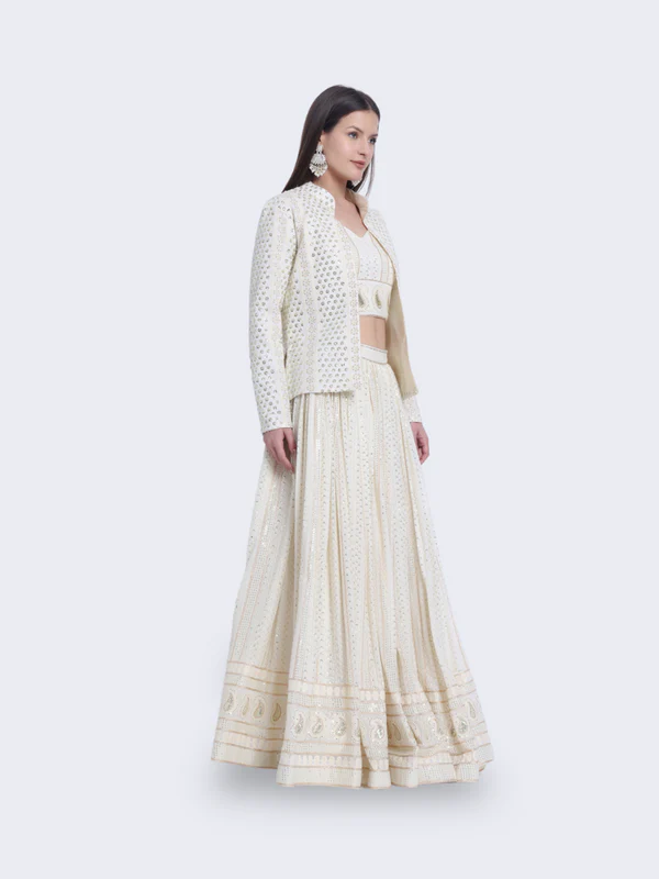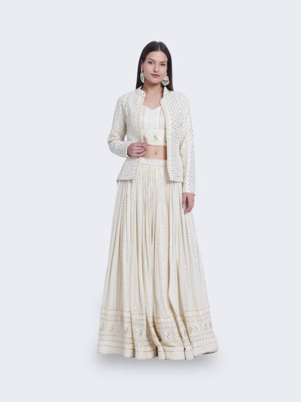 Embrace timeless beauty with our “Ivory Dreamescape Ensemble.” This enchanting ensemble features a cream-colored traditional outfit with a long, flowing skirt, a cropped top, and a matching jacket. Perfect for grand occasions, the “Ivory Dreamescape Ensemble” exudes elegance and sophistication, bringing your dreams to life.