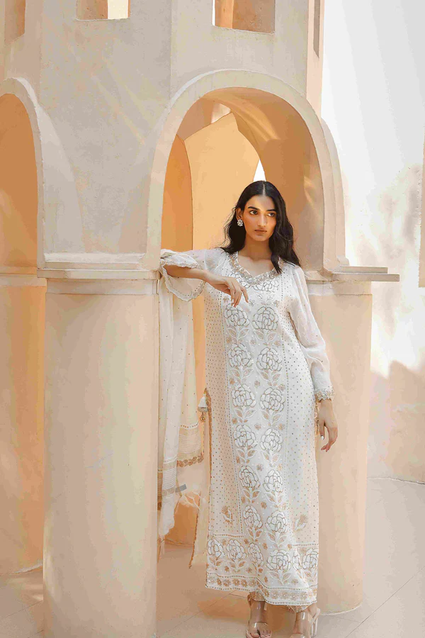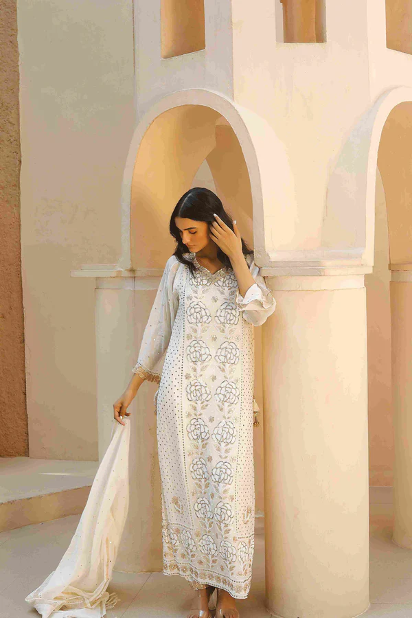 The Golden Serenity kurti set from the Musk Collection features a beautiful white base adorned with intricate golden hand embroidery, mukesh, and chikankari. This luxurious Lucknowi ensemble can be styled with delicate jewelry and elegant footwear for a complete look. Perfect for grand occasions such as weddings, festive celebrations, and upscale events, the Golden Serenity kurti set is designed to make you shine.