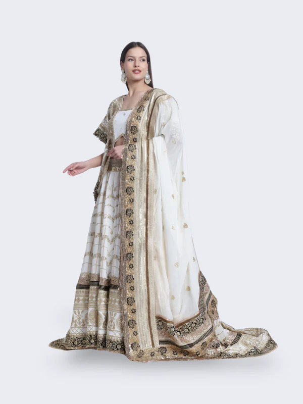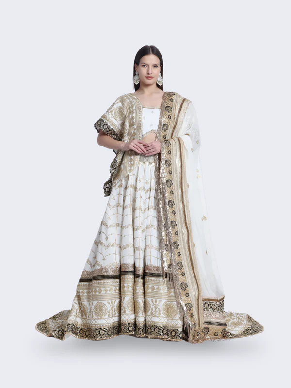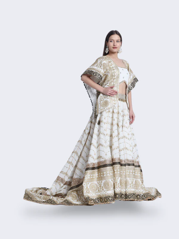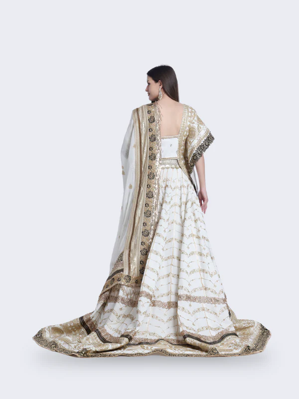 Envelop yourself in the enchanting allure of our “Mystic Opulence” lehenga. Crafted with intricate black and golden details, this masterpiece exudes an air of regality and mystery. Perfect for evening soirees and grand celebrations, let “Mystic Opulence” elevate your style to a realm of unmatched elegance.