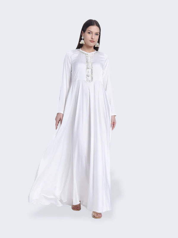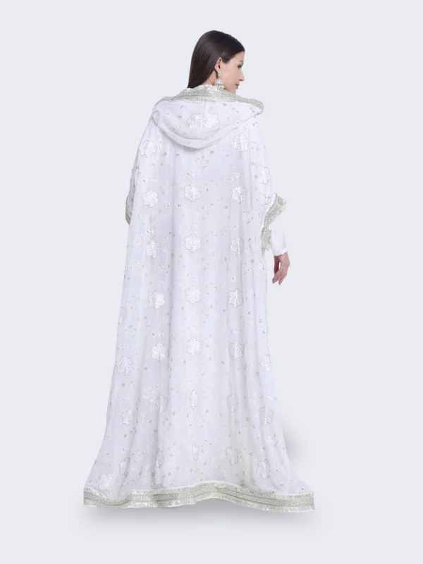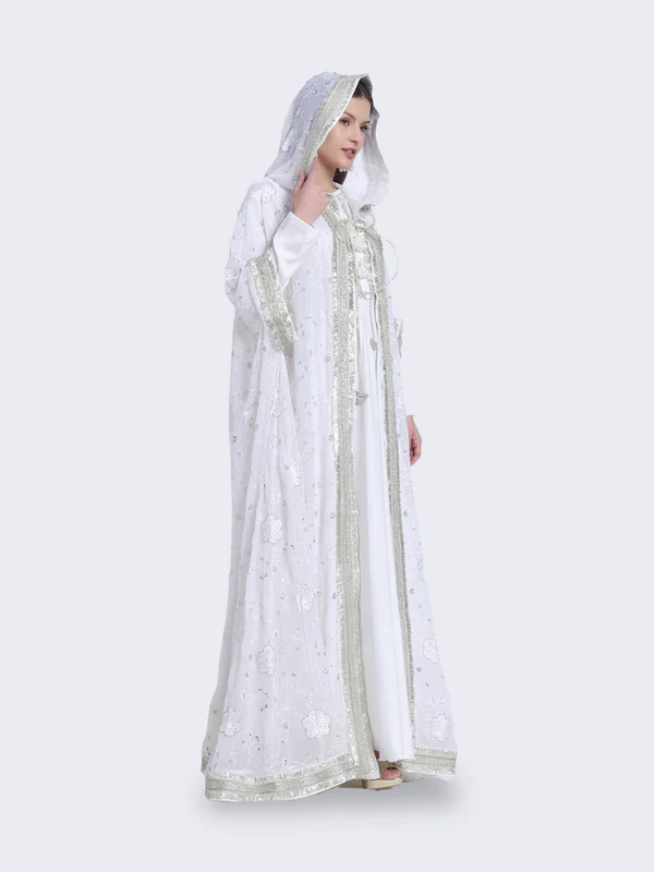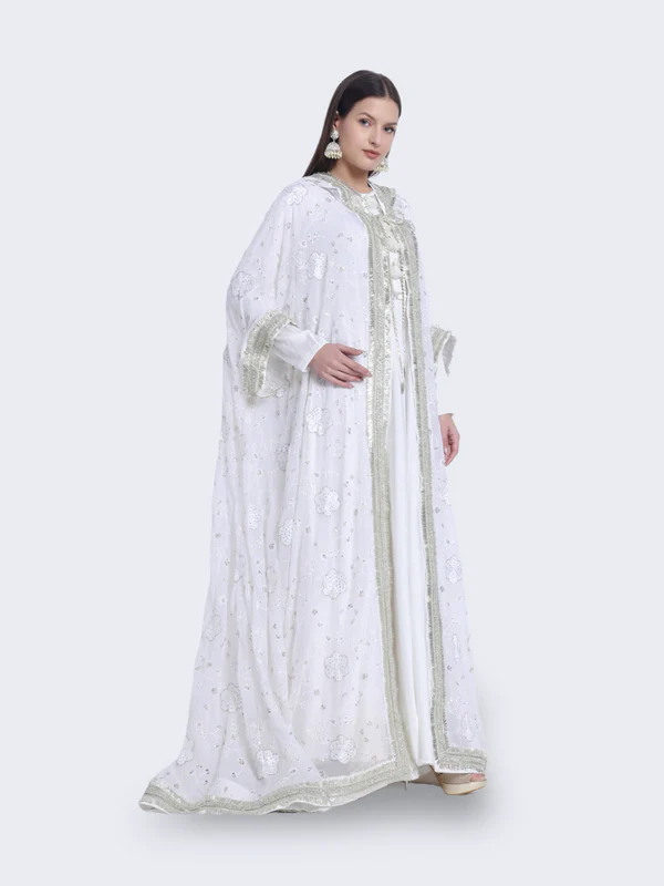 Radiating regal elegance, Noor Al Malak embodies the luminous grace of royalty. Draped in flowing white with intricate gold embellishments, it mirrors the soft glow of moonlight on a crown. A perfect blend of tradition and modern luxury, this masterpiece exudes poise, purity, and timeless sophistication fit for a queen.